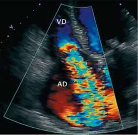 La evaluación debe incluir información sobre las dimensiones de la AD, VD y función sistólica (volumen y fracción de eyección) del ventrículo derecho. Se recomienda la medición de los volúmenes indexados a la superficie corporal, el rango normal de volumen por ETT bidimensional es de 25 ± 7 ml/ m2 en varones y de 21 ± 6 ml en mujeres. Igualmente es importante medir la dimensión del anillo, su dilatación es significativa cuando el diámetro diastólico es mayor o semejante a 40 mm o mayor mm/m2. En la Figura 2 se observa ecocardiograma con regurgitación tricúspide grave.