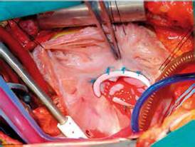 Fotografía transoperatoria: resultado final de anuloplastía tricuspídea con anillo, donde se aprecia coaptación total de las valvas. Tomado deBahamondes J C. Rev Med Clin. Condes. 2022; 33 (3) 235-246.