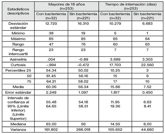 Tabla 2. Estadísticos descriptivos de la Edad y Tiempo de Internación en pacientes con diagnóstico de COVID-19, con y sin bacteriemia por K. aerogenes, internados en la UTI del Hospital San Juan de Dios de la ciudad de Oruro, 2021-2022.