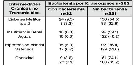 Con respecto a la Enfermedades crónicas no transmisibles, del total de 32 pacientes adultos con COVID-19 y bacteriemia por K. aerogenes, el 9.5% (24) presentaron antecedente de Diabetes Mellitus tipo 2, 6.3% (16) Insuficiencia Renal Aguda, 5.9% (15) Hipertensión Arterial Sistémica, y 3.6% (9) Obesidad.
