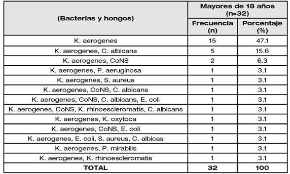 Con relación al Staphylococcus coagulasa negativo la proporción fue 6.3% (2), y solo 3.1% (1) de Pseudomona, Staphylococcus aureus, Staphylococcus coagulasa negativo, Escherichia coli, rhinoescleromatis, K. oxytoca, Proteus mirabilis.