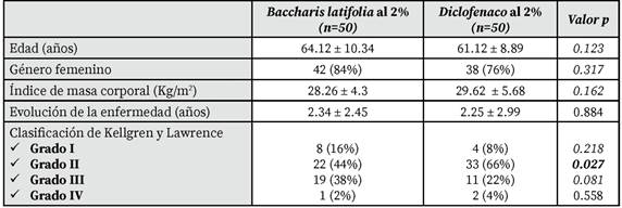 Se reclutaron 100 pacientes mayores de edad, en su mayoría del género femenino, con sobrepeso y más de 2 años de evolución de la enfermedad. Ambos grupos presentaron una mayor frecuencia de OA grado dos según la clasificación radiológica de Kellgren y Lawrence (p=0.027) y no encontramos diferencias estadísticamente significativas entre las variables clínicas (Tabla 1).