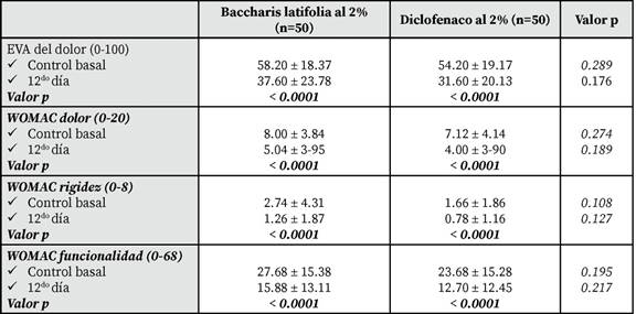 Ambos grupos iniciaron el tratamiento con valores similares de EVA del dolor (58.20 vs 54.20), WOMAC dolor (8.00 vs 7.12), WOMAC rigidez (2.74 vs 1.66) y WOMAC funcionalidad (27.68 vs 23.68), de igual forma, al concluir el tratamiento ambos valores disminuyeron de manera estadísticamente significativa (37.60 vs 31.60, 5.04 vs 4.00, 1.26 vs 0.78 y 15.88 vs 12.70 [p = < 0.0001] respectivamente) (Tabla 2)