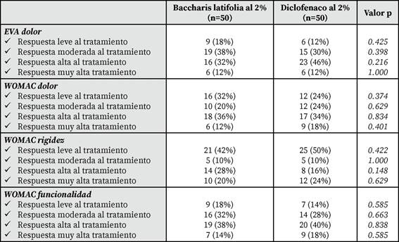 En nuestro estudio evidenciamos diferencias estadísticamente significativas (p=< 0.0001) en ambos grupos de estudio comparando los valores de inicio y de conclusión del tratamiento, utilizando todas las herramientas de clinimetría. La mayoría de los pacientes respondieron al dolor de forma moderada y alta utilizando EVA del dolor, WOMAC dolor y WOMAC funcionalidad. En nuestra revisión de la literatura no encontramos estudios realizados con Bacharis latifolia como tratamiento de OA, sin embargo, Walzer y colaboradores en una revisión realizada el 2015 encontraron resultados similares tras analizar estudios realizados con extractos de plantas medicinales como: Scutelleria baicalensis, Acaria catechu, Boswellia serrata, Cereza, Cúrcuma, Achicoria y Jengibre en el tratamiento de OA de rodilla, comparada con un AINE10, cabe mencionar que ninguna de estas plantas estudiadas son originarias de Sudamérica.