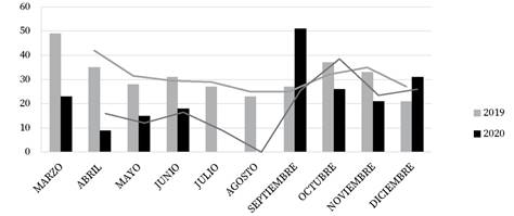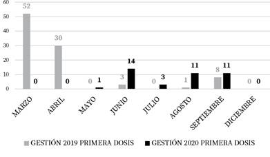 En este estudio se encontró que durante la gestión 2019 en los meses de marzo y abril se administraron la mayor cantidad de primeras dosis de vacuna contra el VPH a la población con un gran contraste de cero dosis administradas en los mismos meses durante la gestión 2020 por las restricciones asumidas tras declarar emergencia nacional esos meses entre marzo a abril, perdiendo la oportunidad de aumentar coberturas de vacunación, como se observa en el GRAFICO N°1.