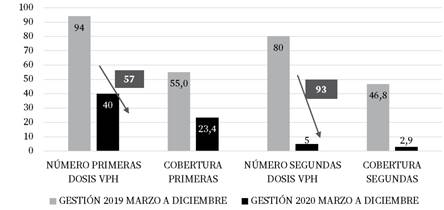 Se trata de un estudio transversal, cuantitativo, descriptivo que estudiándose desde marzo de las gestiones 2019 y 2020: 219 niñas que recibieron las dosis de vacuna contra el VPH y 506 mujeres que se realizaron la prueba de Papanicolaou, en el Centro de Salud Integral Materno Infantil Pampahasi Bajo; clasificándose los resultados por meses comparando los datos de ambas gestiones. Para el trabajo se realizó una ficha de registro con levantamiento de datos del objeto de estudio desde marzo a diciembre de las gestiones 2019 y 2020, se recolectaron los datos de los informes de producción 301 a (SNIS mensual) y del cuaderno de seguimiento del programa de Prevención y Tamizaje de cáncer de cuello uterino del establecimiento de salud, con autorización de los inmediatos superiores del establecimiento. Los datos fueron analizados a través del paquete estadístico SPSS, y los cuadros de salida y gráficos mejorados con el paquete de office EXCEL. Se trabajo con un IC de 95%, y prueba de T de Student para muestras relacionadas como pruebas de significancia estadística.