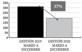 La diferencia representada en porcentajes es de 37% menos comparada con la gestión 2019 en condiciones normales sin las medidas de restricción, como se observa en el GRAFICO N°4