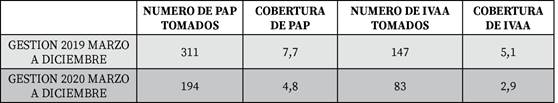 El CUADRO 1, expone las coberturas de pruebas de tamizaje para la prevención de cáncer cervicouterino realizadas en el sistema de salud del país, estableciéndose que el número de pruebas de Papanicolaou y de Inspección visual con acido aceitdo IVAA disminuyeron durante la gestión 2020 en el establecimiento de salud.