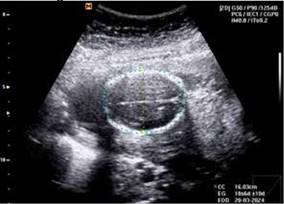 En la valoracion por servicio de medicina materno fetal a las 21.6 semanas de embarazo por FUM (fecha de ultima menstruación) se realiza ecografía obstétrica y doppler de arterias uterinas,con reporte de feto único vivo con situación indiferente, FCF:145 lpm, peso aproximado de 266 g en percentil 1 para Hadlock, líquido amniótico cualitativamente disminuido, con bolsillo vertical máximo de 1.11, placenta corporal anterior grado I de Grannum. DBP: 19.1mm para 19.1 SDG, CC: 160.3 mm para 18.3 SDG, CA: 135.2 mm para 19 SDG, LF: 27.7mm para 18.3 SDG. Tabla 1. Figuras 1, 2.