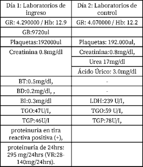 Dos meses después la paciente acude nuevamente al servicio de emergencias, con clínica de cefalea de moderada intensidad, tinitus, fosfenos e incremento de volumen en miembros inferiores, con cifras tensionales de 130/90mmHg. Es hospitalizada con los diagnósticos de: Embarazo de 32.6 semanas, Preeclampsia con datos de severidad, edad materna de riesgo. El mismo día, con cifras tensionales de 170/100 mmHg a pesar de recibir tratamiento antihipertensivo se solicita valoración por la unidad de terapia intensiva. Se realizan laboratorios de toxemia. Tabla 2.