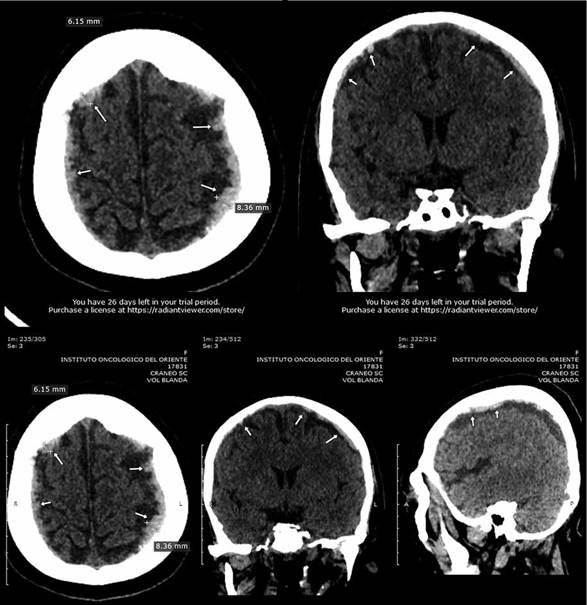 TC de cráneo sin contraste, que evidencia las lesiones hemorrágicas causado por el fármaco acumulado MTX, en el que se realizaron múltiples cortes axiales volumétricos del cráneo sin la inyección de material de contraste iodado, en un segundo tiempo se realizaron reconstrucciones sagitales y coronales. Se evidencia a nivel infratentorial: El cuarto ventrículo y el conjunto de espacios subaracnoideos basales son de morfología y topografía normal. Mientras que a nivel supratentorial: No hay desplazamiento de la línea media, a nivel extra axial se evidencia colecciones hiperdensas subdural con grosor máximo de 6mm en región frontal derecha y 8mm en región frontal izquierda; a nivel óseo no se observa lesiones patológicas en la calota craneal.