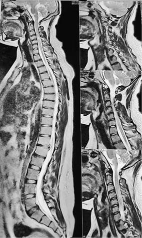 Se trata de un paciente masculino que responde a las iniciales E.A.T. de 24 años de edad, natural y residente de la ciudad de La Paz, sin antecedentes patológicos y familiares de importancia; su cuadro clínico se inicia en marzo de 2022 posterior a sufrir un asalto y agresión con arma blanca, produciéndole herida punzocortante profunda en región cervical derecha de aproximadamente 3 centímetros de longitud; fue evaluado en el servicio de emergencias del Hospital La Paz y posteriormente derivado al Hospital de Clínicas Universitario; se realizaron estudios complementarios como Resonancia Magnética con contraste ponderada en T2 sagital en la que se evidencio una señal hiperintensa en relación a lesión medular aguda a nivel de C4-C5 que se comunica con el canal espinal. Protrusión posterior discal del disco T12 - L1 con desgarro anular central y protrusión que indenta el saco Tecal ventral; el disco presenta disminución de la hiperintensidad y del espacio intervertebral. (Figura 1)