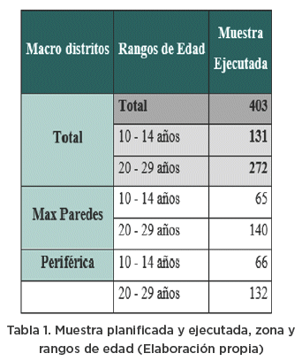 En total, se aplicaron 403 encuestas de manera directa. Se encuestaron a 131 niñas: 65 estudiantes del Colegio Cristóforo Colombo, de la zona Max Paredes, y 66 estudiantes del Colegio Ricardo Jaimes Freyre de la zona Periférica. En el caso de las mujeres jóvenes se aplicaron 272 encuestas, administradas también de forma directa (140 en la zona Max Paredes y 132 en la zona Periférica). El cuestionario de 23 preguntas siguió una secuencia lógica que comenzó con interrogantes sociodemográficas: edad y zona, continuando con aspectos referidos a cada una de las hipótesis planteadas. En el caso de las Unidades Educativas, ambas son públicas, pues no se obtuvo autorización para aplicar la herramienta en colegios privados. El levantamiento de información primaria abarcó los meses de julio y agosto de 2018.