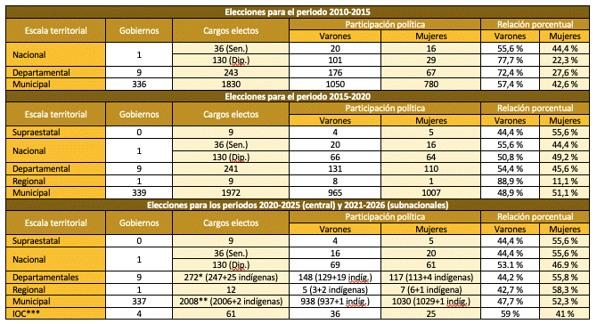 Tras las elecciones de 2010, en ninguna de las escalas de gobierno las mujeres (39,8 %) superaron a los varones (60,2 %) en la ocupación de cargos en el Órgano Legislativo. Tras las elecciones generales de 2014 y subnacionales de 2015, únicamente en la escala municipal de gobierno, las mujeres superaron a los varones con el 51,1 %, además de los cargos supraestatales. En las demás escalas, los varones continúan ocupando mayoritariamente los cargos legislativos. Tras las elecciones generales de 2020 y las subnacionales de 2021, salvo en la Cámara de Diputados del Gobierno central, las mujeres llegaron a ocupar la mayoría de los cargos en los órganos legislativos de las cuatro escalas de gobierno: en el Senado con el 55,6 %, los supraestatales con el 55,6 %, en las asambleas departamentales con el 55,8 %, en la única Asamblea Regional con el 58,3 % y, finalmente, en los concejos municipales con el 52,3 %.