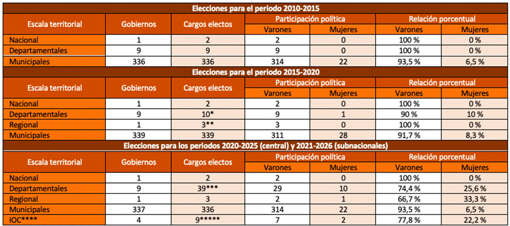 ***** El GAIOC de Charagua Ivanbae tiene seis cargos electos en su órgano ejecutivo. Sólo para uno fue electa una mujer; el 2019 entra en vigor el GAIOC de Salinas el cual tiene un cargo en su órgano ejecutivo. En septiembre del mismo año fue electa una mujer para ocupar el cargo.