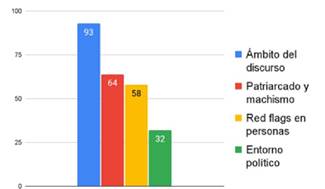 El ámbito del discurso al que más de la mitad de los videos (55%) hace referencia es al ámbito amoroso. Se presentan advertencias sobre las relaciones de pareja porque algunas de estas red flags podrían acabar en hechos violentos para alguna de las personas en la relación. Los contenidos sobre el ámbito laboral y de amistad están presentes en 17 videos. El ámbito familiar solo abarcó 10 videos y en el ámbito académico solo había 5 videos.