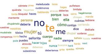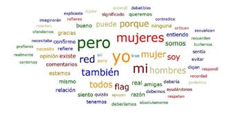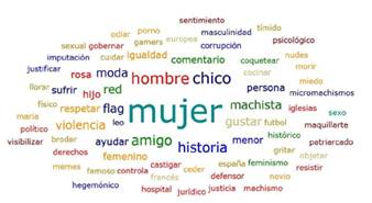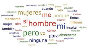 Lo que más sobresale son las palabras 'hombre', 'mujeres', 'ninguna' y 'porque', presentes en los comentarios que hacen comparaciones entre hombres y mujeres, en los que se menciona que los varones son mejores que las mujeres en ciertas cosas, o viceversa. Por ejemplo, "Yo juego al fútbol soy niña y les gano a los de mi clase" y "es verdad que sois inferiores en cuanto a juego