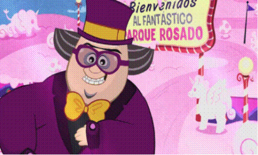 En otro caso, y con un aspecto similar al personaje de Willy Wonka del película Charlie y la fábrica de chocolate, en otra escenografía publicitaria, el "Dr NO" promociona un parque de esquí de color rosa que combina diversión, dulces y nieve comestible (figura 11). Con astucia y perspicacia, los adolescentes descubren que la tonalidad es generada a causa de un alga microscópica llamada chlamydomonas nivalis, la cual produce una sustancia de color rosada que no es comestible; este es el principal motivo por el que la población se siente enferma. Entonces, la escenografía habilita un diálogo con las características del mundo publicitario, el cual es desenmascarado gracias a los conocimientos que aporta el saber científico. En esta instancia, la comunicación de la ciencia adquiere un estatuto de "heroína" o de "justiciera" que permite tomar conocimiento de los actos inescrupulosos de algunos actores sociales. En este sentido, el modelo de ciencia que se repone es el de una herramienta que está al servicio de la ciudadanía para resolver problemas, garantizar el bienestar ambiental y reconocer los conflictos y los posibles sujetos que ejercen prácticas maliciosas.