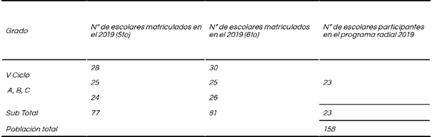 El estudio recoge la experiencia de 23 escolares del V ciclo de la Institución Educativa Familia Sagrada de Andahuaylas participantes en el programa radial "La Voz de los Niños", que se constituyó en la muestra de estudio por su asiduo involucramiento en proyecto radial que duró 12 meses durante el 2019, bajo la guía del director del Centro Educativo.