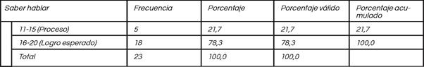 En la educación básica peruana, la calificación en el nivel primario es literal, pero requiere de intervalos numéricos para conocer la situación académica del escolar. Según la tabla 3, la mayoría de estudiantes representado por el 78.3% lograron desarrollar el saber hablar, que va más allá de articular o emitir sonidos, significa que los estudiantes se expresan con pertinencia considerando el contexto comunicativo y la situación de su interlocutor.