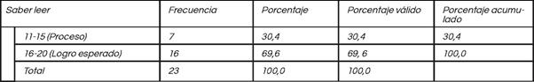 En la tabla 5, se presentan los resultados de la evaluación pedagógica en la dimensión saber leer, evidenciando que siete estudiantes se encuentran en proceso con notas de 11 y 15. Además, 16 escolares obtuvieron una calificación entre 16-20 encontrándose en la situación de logro esperado. Significa que los niños participantes en la propuesta radial no solo articulan y reconocen el alfabeto, sino también comprenden lo que leen, contextualizan su lectura y realizan inferencias, siendo capaces de proponer en torno a la lectura.
