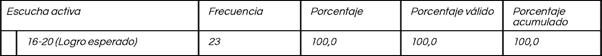 La tabla 6 contiene el resultado de la prueba pedagógica de la dimensión escucha activa, al respecto se muestra que los 23 escolares participantes en el proyecto radial "La Voz de los Niños" obtuvieron una calificación entre 16 y 20 encontrándose en el nivel de logro esperado. Quiere decir que los escolares son empáticos con su interlocutor, mantienen la mirada activa en la conversación, de la cual obtienen información y es capaz de construir un contenido apropiado para la interacción comunicativa.
