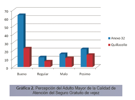 In Bolivia a 7% of the population is olderAdult (AM), of which the 61% lives in the poverty; because of it was promulgated the law 1889 that puts in force the Health Insurance for Elderly (SMGV), nevertheless the National Caja of Health (CNS) bears the 88% of them affiliated to the SMGV, by which this at present paralyzed by the demand of services, with the con-sequent loss of quality in the attention of the AM.Therefore we develop this transversal descriptive study, for the purpose of determining the perception of the OlderAdult about the quality of care and the physician-patient relationship within the framework of the benefits of SMGV.We analyzed 170 samples, 114 in the CNS polyclinic Annex 32 and 56 in the CNS Quillacollo. We note that the perception about the quality of care SMGV in the CNS is good in 51 % of cases, 27% classified as fair to the poor and 22% as terrible. About the physician-patient relationship, we have 68% of patients agree with their attention in the SMGV. It concludes with this study that the level of treatment and quality of patient careAM,we still lacka lot to move forward, a deal or just a cordial handshake would be a good start for better treatment of the elderly.