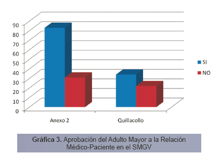 Referente a la relación médico paciente tenemos que 117 (68%) pacientes están de acuerdo con el trato que se les brinda en el SMGV, mientras que 32% no lo está; tampoco se encuentran diferencias entre Anexo 32 y Quillacollo (P>0,1). (Ver gráfica 3.)
