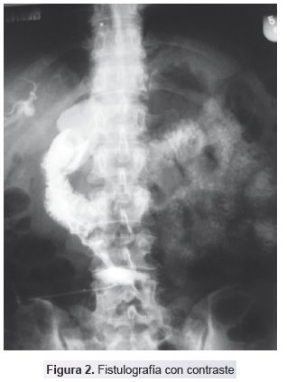 Fistulografía: Reporta fístula colecisto entero-cutánea, colelitiasis y ¿síndrome de Mirizzi? (Fig. 2).