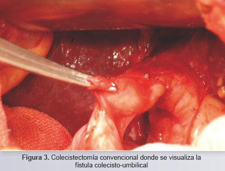 La apertura externa de una fístula colecistocutánea la mayoría de las veces ocurre en el hipocondrio derecho. Sin embargo, otros sitios pueden estar implicados, como el hipocondrio izquierdo (45 %), el ombligo ( 27 %), la región lumbar derecha, la fosa iliaca derecha y región glútea. Por tanto, el objetivo es exponer el caso de una paciente con fístula colecisto-umbilical espontánea, secundaria a colecistolitiasis, atendida en el Instituto Gastroenterológico Boliviano-Japonés. Paciente sexo femenino, 47 años de edad, presentó con cuadro clínico de dolor abdominal de 25 años de evolución, localizado en hipocondrio derecho, con salida de material purulento de color amarillo-verdoso a través de un orificio de aproximadamente 3mm, situado a nivel de la cicatriz umbilical. Se realizó fistulografía a través del orificio umbilical visualizándose trayecto fistuloso de o la vesícula biliar al ombligo; el conducto cístico y el colédoco estaban permeables. Se trató quirúrgicamente, mediante colecistectomía convencional con resección del trayecto fistuloso.