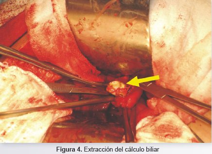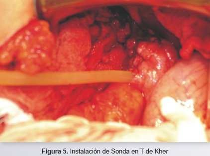 Se programa cirugía, se realiza colecistectomía abierta mediante insición de Kocher, colocación de sonda en T de Kher, fistulectomía y biopsia hepática (Fig. 3, 4 y 5).