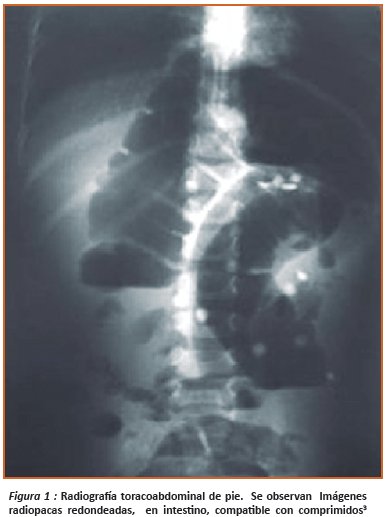 Es importante también solicitar una radiografía simple de abdomen, que confirma, el diagnóstico y la severidad del cuadro clínico, valora indirectamente la presencia de hierro en el tracto gastrointestinal como material radio-opaco, y permite valorar perforación intestinal si se presenta5,7 ( Figura 1).