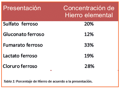 El hierro es un elemento esencial para diversas funciones del organismo, sin embargo, en dosis elevadas se convierte en una sustancia tóxica que puede producir muerte, la intoxicación en edad pediátrica por hierro es principalmente por ingesta accidental, debido a la gran disponibilidad en los hogares con presentación en diversos jarabes y vitaminas. La intoxicación depende de la concentración en sangre, para lo cual es necesario saber las equivalencias de acuerdo a las presentaciones farmacológicas1,3,5,9,10 (tabla 1).