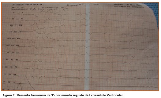 El electrocardiograma de horas 19:44 muestra taquicardia sinusal de 150 latidos por minuto que se conduce con bloqueo de rama derecha. En el electrocardiograma de horas 20:35 se muestra una frecuencia cardiaca de 35 latidos por minuto seguido de Extrasístole Ventricular (Figura 1). Se decide colocación de monitoreo temporal y su internación en UTI.