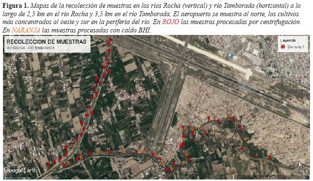 El presente estudio es de tipo descriptivo, transversal y cuantitativo, el universo fueron las aguas de los ríos utilizados como fuentes de agua en la zona Maica (Río Tamborada y Río Rocha) cercanas a la planta de tratamiento de Albarrancho. Los criterios de inclusión fueron las zonas de los ríos que se utilizan para el riego de cultivo y los criterios de exclusión fueron las zonas de los ríos que no se utilizan para el riego. Durante el mes de Julio de 2018 se tomaron las muestras cada 80-100 m a lo largo de los ríos. Se recolectaron 70 muestras (26 muestras del Río Rocha y 44 del Río Tamborada) en envases de plástico estériles, las cuales fueron transportadas a 4°C en cajas isotérmicas (ver Figura 1). Se extrajo 50 ml de agua del río en cada envase; se emplearon 2 técnicas para la concentración de las bacterias: una consistió en la centrifugación de 5 ml del agua a 2000 revolución por minuto (r.p.m.) por 5 minutos, (en 50 muestras), y la otra técnica fue por enriquecimiento con 50 ml de caldo de enriquecimiento Cerebro Corazón (Difco) (en 20 muestras). Una vez concentradas las muestras se sembraron en Agar McConkey suplementado con Cefotaxima a 2 μm/ml, se incubaron a 37°C por 24 horas, las colonias que crecieron se consideraron resistentes a cefalosporinas de tercera generación.