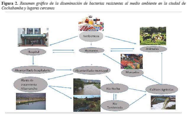 En conclusión, las aguas de los Ríos Rocha y Tamborada son un reservorio de cepas de Escherichia coli productoras de Beta-lactamasas de espectro extendido (BLEE) y con posible mecanismo de resistencia de tipo AmpC plasmidial. Estas bacterias se han distribuido en el medio ambiente, saliendo de los hospitales, casas y diferentes partes de la ciudad, pasando por el alcantarillado que vierte sus aguas residuales en los ríos Rocha y Tamborada, cuyas aguas son utilizadas en el riego agrícola de los cultivos en la Zona Maica (Figura 2). El hallazgo de estas Enterobacterias productoras de BLEE en aguas de ríos empleadas en la actividad agrícola, representa un riesgo de salud pública, debido a que pueden contaminar alimentos que son enviados a mercados de abasto de la ciudad de Cochabamba y por lo tanto estarían propagando bacterias que no sólo van a dar problemas en cuanto a tratamiento si causan enfermedades infecciosas, si no que pueden ser fuente de diseminación de mecanismos de resistencia antimicrobiana a otras especies bacterianas.