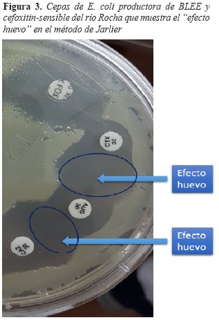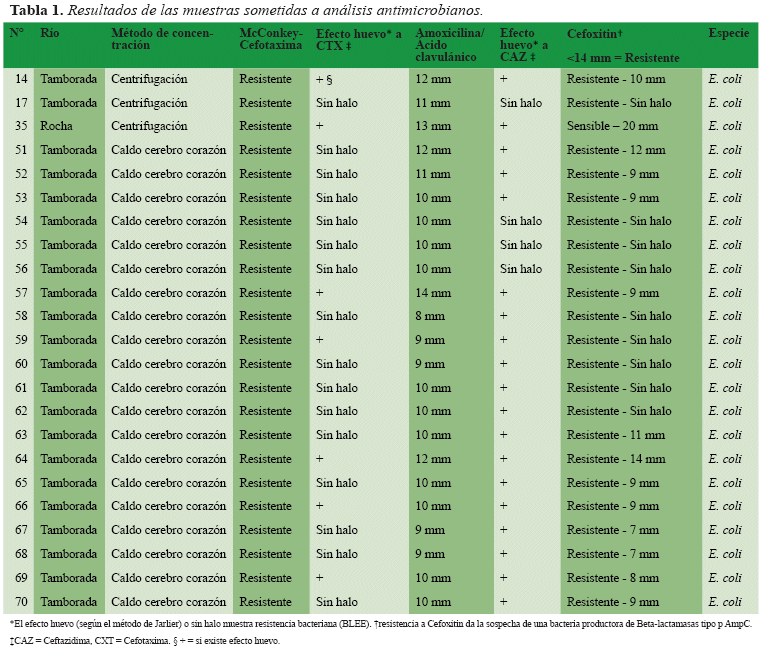 De acuerdo a los métodos de concentración de agua que se emplearon tenemos los siguientes resultados: De las 50 muestras centrifugadas (Tabla 1) provenientes del Río Rocha (26 muestras) y Río Tamborada (24 muestras) se obtuvieron 3 cepas cefotaxima-resistentes, las cuales se identificaron como E. coli productoras de BLEE (6%), siendo 2 de ellas además resistentes a la cefoxitina (posibles productoras de beta-Lactamasas AmpC).
