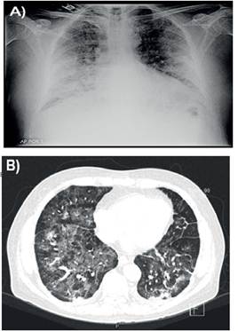 A) Radiografa tórax AP al ingreso B) Tomografia axial con ventana pulmonar al ingreso