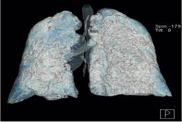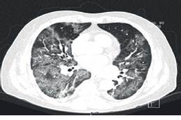 Debido a la sobreexigencia de los servicios médicos y laboratoriales por aquel momento, no se tiene confirmación positiva de la RT-PCR SARS-CoV-2 hasta los 3 días de su admisión intrahospitalaria. Se toman nuevas analíticas de control y en éstas se aprecia notable aumento del dímero-D llegando hasta los 4 360 ng/ml (Ver Tabla. 1). En el contexto de un paciente con progresiva escalación de las medidas ventilatorias con cánulas nasales de alto flujo y bajo la utilización de los índices Rox y Kirby, aunado al aumento de la respuesta inflamatoria sistémica, se sospecha de tromboembolia pulmonar (TEP) versus alguna coinfección o sobreinfección por lo que se solicitan angiografía por tomografía computada (Angio-TC), TC-Tx de control y panel PCR respiratorio. En Angio-TC no se identifican datos sugerentes de TEP, TC-Tx muestra hallazgos compatibles con neumonía producida por SARS-CoV-2 en fase moderada, progresión de la infección en base a última toma de control, atelectasias y consolidaciones bilaterales hacia las bases (Ver Figura. 2 y 3). Panel PCR respiratorio revela la detección del virus Influenza A H1N1.