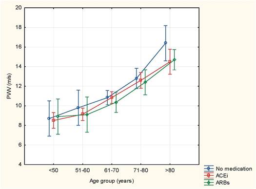 Pulse wave velocity (PWV) was measured in all patients, but the most prominent results were found in patients taking ACEi, ARBs or none. Compared to the same age group ARBs showed the lowest PWV values while patients without medication showed the highest (image 1). Only moxonidine and BB did not show a decrease in PWV values (p=NS, respectively) while adding other antihypertensives reduced PWV values. Smokers had comparable PWV values to nonsmoker patients (p=NS). Average brachial systolic blood pressure was 190.87±9.61 mmHg, Average brachial diastolic pressure was 108.91 ± 16.23 mmHg. Average central systolic blood pressure was 155.34±19.61 mmHg, and average central diastolic blood pressure was 102.86±17.14 mmHg. Values of PWV were higher than reference values for their age in all patients, averaging at 10.71±1.96 m/s. PWV values show positive correlation with age (r=0.9461, p<0.0001)