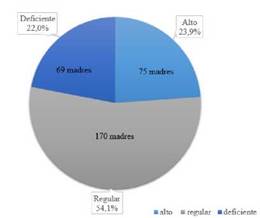 La muestra estuvo conformada por 383 madres de familia que habitan en la provincia de Jaén, departamento Cajamarca, Perú. Se incluyeron a 314 madres mayores de 18 años, con hijos menores de seis años, residentes por seis meses o más en la provincia de Jaén. Se empleó un cuestionario validado por juicio de ocho expertos y compuesto por 20 preguntas de opción múltiple.
