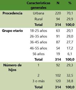 El 70,1% de las madres procedía de zonas urbanas de la provincia de Jaén, con edades comprendidas principalmente entre los 26 y 35 años de edad (29,0%). Además, el 38,2% de madres manifestaron tener tres o más hijos (Tabla 1).