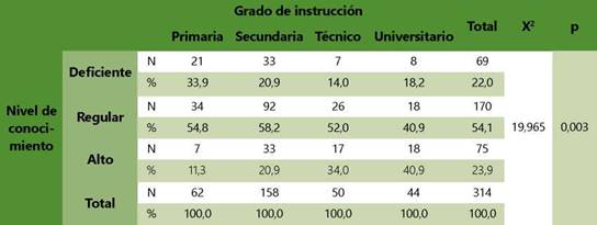 Respecto al grado de instrucción de las madres y su nivel de conocimiento, se evidenció que el nivel educativo estuvo asociado significativamente al conocimiento en las madres evaluadas (Tabla 2). Al respecto, Abd El-Aal et al.19 demostraron que la educación de la madre es un factor que afecta las prácticas preventivas sobre las infestaciones parasitarias intestinales en Egipto. Sumado a ello, otro estudio realizado en La Habana determinó que el bajo nivel de educación influye en una alta incidencia de enfermedades, ya las acciones de salud no son asumidas de forma correcta y oportuna por la población con esta característica21.