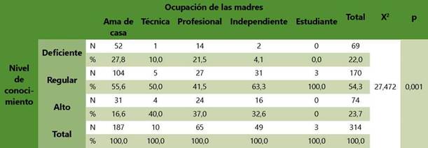 Las participantes firmaron un consentimiento informado para confirmar su participación voluntaria en la investigación. Además, los datos obtenidos se emplearon únicamente con fines de investigación, considerando la Declaración de Helsinki. Para el análisis descriptivo de los datos se utilizó Minitab® 19 para Windows® versión 8. Se calcularon frecuencias absolutas y relativas para las variables cualitativas. Mediante la prueba de chi cuadrado (X2) se determinó la asociación del nivel de conocimiento de las madres con su grado de instrucción y ocupación (p<0,05).