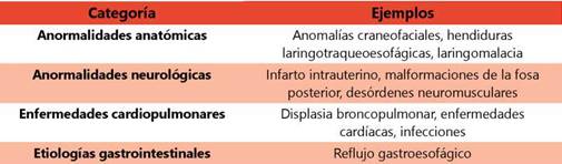La incidencia de la disfunción de la deglución también es significativa en aquellos bebés con afecciones subyacentes como displasia broncopulmonar, cardiopatía congénita, atresia esofágica (AE) y/o fístula traqueoesofágica, así como trastornos neuromusculares que interrumpen la coordinación compleja de las funciones sensoriales y motoras necesarias para realizar una deglución segura8. La disfagia es muy común en niños con laringomalacia (LM), definida como la inmadurez congénita de la laringe que provoca un ruido respiratorio característico -estridor- por colapso de la glotis durante la inspiración. En un amplio estudio, de 324 pacientes con LM se observaron síntomas de disfagia en el 50,3% de los casos9. Los niños con AE tienen mayor riesgo de presentar RGE y complicaciones asociadas, como estenosis anastomóticas10. Otros autores han observado que niños con AE intervenida y menores de 1 año de edad, la prevalencia de disfagia era del 55%11. Las etiologías más comunes de la DP se resumen en la Tabla 1 12.