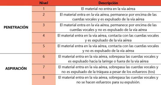Fuente : 17Rosenbek JC, Robbins JA, Roecker EB, Coyle JL, Wood JL. A penetration-aspiration scale. Dysphagia. 1996;11(2):93-8. Disponible en:https://pubmed.ncbi.nlm.nih.gov/8721066