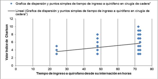 Figura 1. Se observó en la gráfica que a mayor tiempo de espera de ingreso a quirófano incrementa el grado de Índice de Charlson de esta manera obteniendo la supervivencia del mismo será menor a los diez años