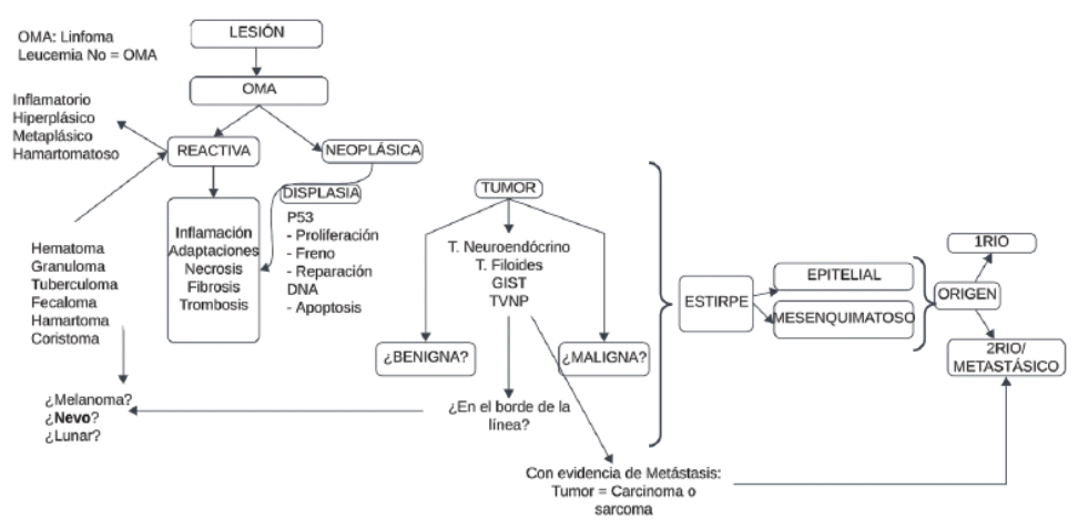 Figura 2: Flujograma de lesiones Reactivas incluyendo Displasia VS Neoplásicas benignas, malignas y limítrofes, con sus respectivos ejemplos y conflictos cognitivos. Autoría propia.