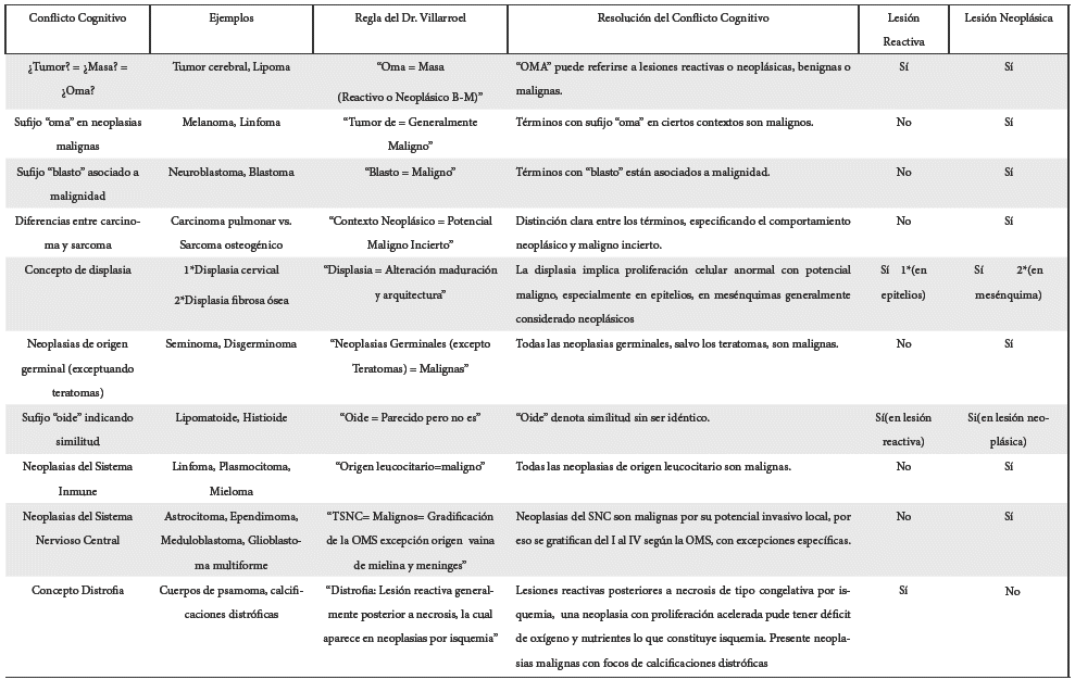 Las presentes reglas inéditas buscan sistematizar la nomenclatura de las neoplasias, facilitando su comprensión y desenredando los conflictos cognitivos de forma concisa, precisa y sólida, lo que lleva a su aplicación en la parte clínica sin generar más confusión ni conflictos, ya que resuelven los mismos en casi su totalidad. Este artículo revisa exhaustivamente los conflictos cognitivos y las reglas propuestas, utilizando ejemplos específicos para ilustrar cada punto, resolviendo además los conflictos cognitivos que con más frecuencia se enfrenta el profesional en salud (Ver Figura 1).