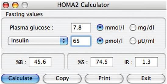 Figura 1: Calculadora HOMA 2. El modelo de evaluación de la homeostasis 2 (HOMA2) estima la función de las células beta en estado estable (HOMA % B) y la sensibilidad a la insulina (HOMA % S), como porcentajes de una población de referencia normal. El resultado del modelo está calibrado para dar una función de las células beta normal del 100% y una sensibilidad a la insulina normal del 100%. 10
